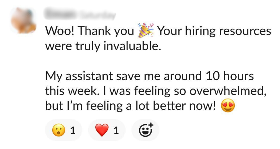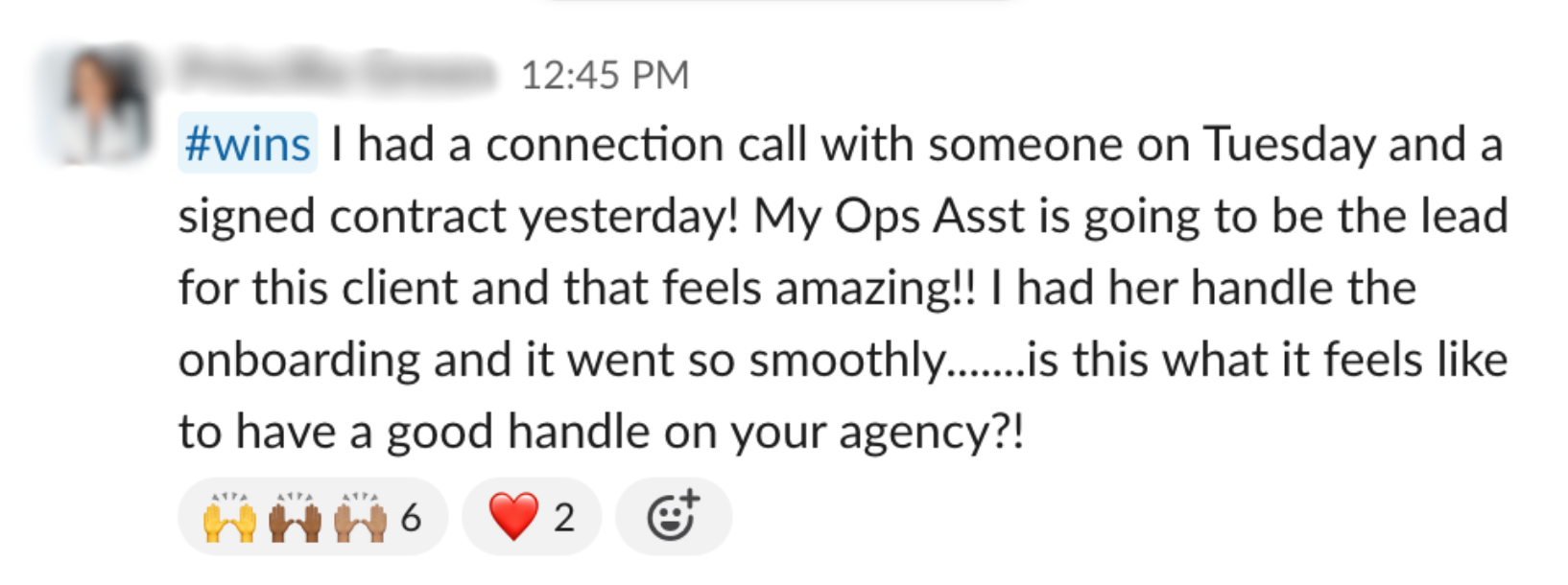 It's helped me truly go "all in" on the agency model in my business, because I've felt more confident in what that would look like and how to manage it. I've gained a new assistant in my agency (it was just me and an ops assistant, and now it's me, my ops assistant, and a general admin VA) and her onboarding was a breeze thanks to the help from Agency Alliance.