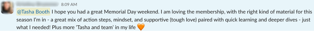 "I love having the support from a great coach like Tasha who is transparent and insightful. Also, the community is top notch!"